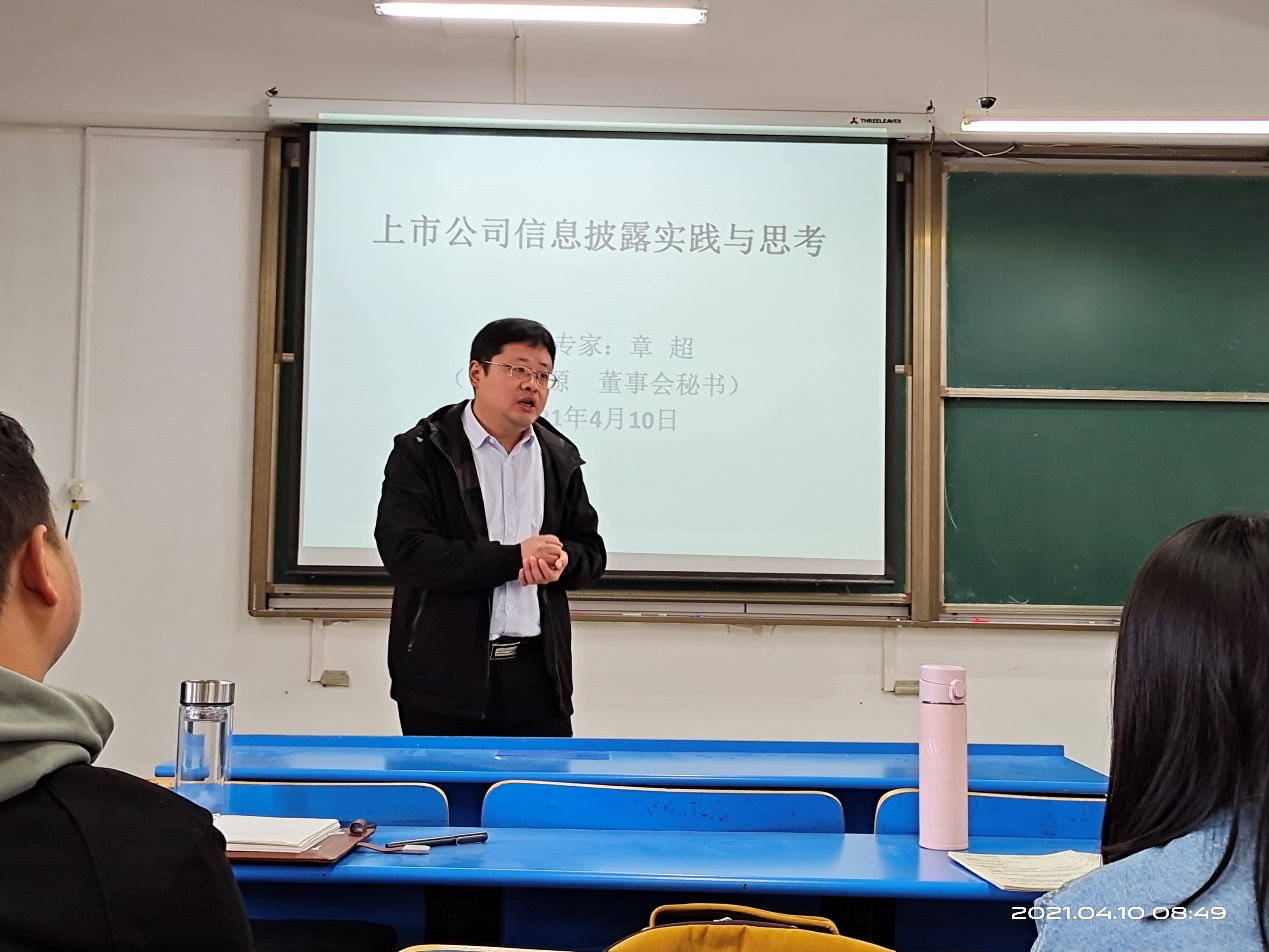 4月10日,中钢集团安徽天源科技股份有限公司副总经理、董事会秘书兼总法律顾问章超应邀为公司2020级MBA学员作题为“上市公司信息披露实践与思考”报告。报告会由TapTap点点教授章铁生主持。