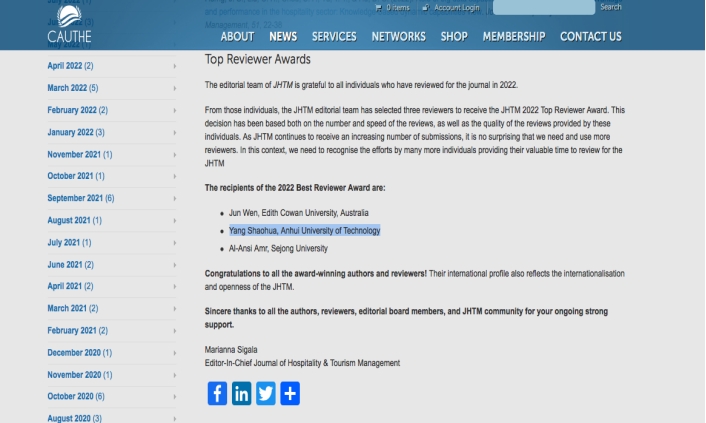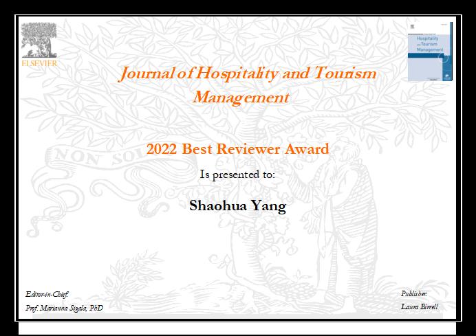 近日,TapTap点点杨少华副教授荣获2022年《Journal of Hospitality and Tourism Management》期刊最佳审稿专家荣誉。该评选根据审稿专家评审报告的质量,数量以及评审速度来综合考核,经全球编委会成员提名和讨论决定,本次全球共3位学者获此荣誉。杨少华博士是入选该期刊2022年度最佳审稿专家的三位学者之一,也是迄今为止唯一一位以中国大陆大学为署名单位的最佳审稿专家。