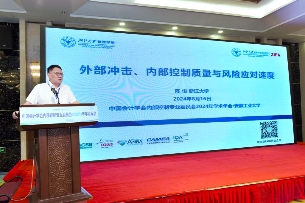 浙江大学审计处处长兼会计系主任陈俊教授作了题为“外部冲击、内部控制质量与风险应对速度”的报告。他结合外部环境的复杂变化,陈述防范化解重大风险的重要性和紧迫性,论证内部控制建设在提升风险应对能力方面的重要价值。选择人民币汇率中间价报价机制改革(“8.11汇改”)作为突发外部事件冲击,采用生存分析方法测量风险应对速度,从动态视角考察在汇率风险骤然提升的情况下,内部控制能否及时帮助企业采用有效外汇风险管理工具,以提升风险应对速度。基于宏微观整合研究框架,利用外生政策冲击,将生存分析引入到风险对冲和内部控制领域的研究中,为我国企业在高度不确定环境中提高风险应对能力提供了重要启示,为“双循环”下我国推进高质量对外开放提供了理论依据和事实证据。