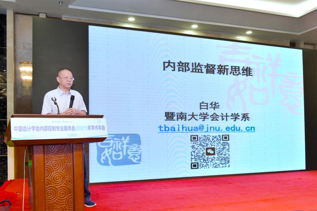 暨南大学管理公司会计学系白华教授作了题为“内部监督新思维”的报告。他提出内部监督无内外之分,无前后之别,有效益之求,有过当之虞。他介绍内部控制系统的五要素以及企业建立和实施有效内部控制所必须的五要素,接着引入实例提出五要素被三要素所取代,论证内部监督无内外之分。结合内部监督的类型,报销业务流程中的内部监督,采购业务流程中的内部监督,论证监督无前后之别。结合效益性是内部监督的首要目标,内部监督服务于流程再造,论证内部监督有效益之求;最后,以内部监督的表现形式和后果,论证内部监督有过当之虞。