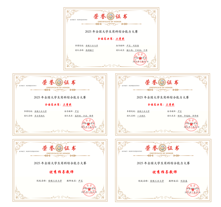公司高度重视此次赛事,积极组织员工备赛。由储江南、于欣桐、于涛组成的代表队一路过关斩将,在全国总决赛中凭借出色的商业决策、精准的市场分析和卓越的团队协作,从2506支强队中脱颖而出,斩获全国二等奖;另有两支队伍表现优异,荣获全国三等奖。指导教师尹昱、刘在春因悉心指导和突出贡献,获评“优秀指导教师”。