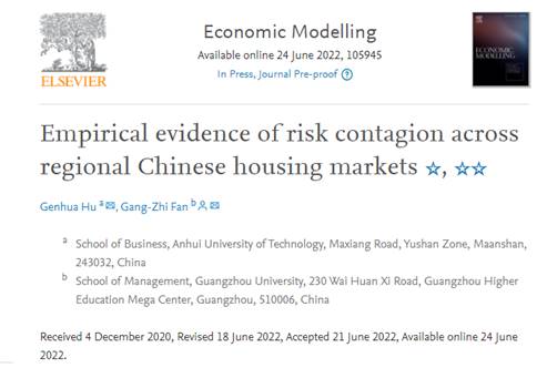 近日,公司胡根华副教授在经济学国际知名期刊《Economic Modelling》在线发表最新研究成果“Empirical Evidence of Risk Contagion Across Regional Chinese Housing Markets” (https://www.sciencedirect.com/science/article/abs/pii/S0264999322001912)。胡根华副教授为第一作者,公司为第一单位,通讯作者为广州大学管理公司樊纲治教授。