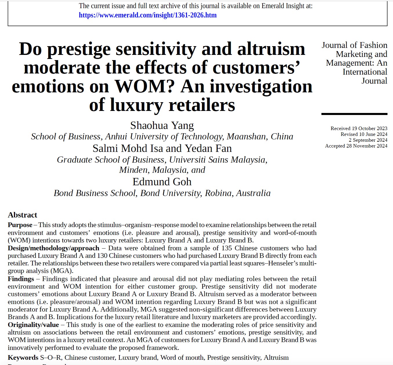 近日,公司杨少华副教授以第一作者身份在国际知名期刊《Journal of Fashion Marketing and Management》(简称JFMM,中文名《时尚营销与管理杂志》)上发表了一篇题为《Do prestige sensitivity and altruism moderate the effects of customers’ emotions on WOM? An investigation of luxury retailers》的学术论文。合作作者包括马来西亚理科大学的樊烨丹博士和澳大利亚邦德大学的Edmund Goh教授,公司为该论文的第一单位。JFMM是一份致力于时尚营销与管理领域实证研究的国际知名期刊,在JCR排名中属于SSCI二区,最新影响因子为3.2。该期刊旨在传播时尚营销与管理领域的前沿知识,涵盖可持续发展、社会责任和数字化创新等主题。