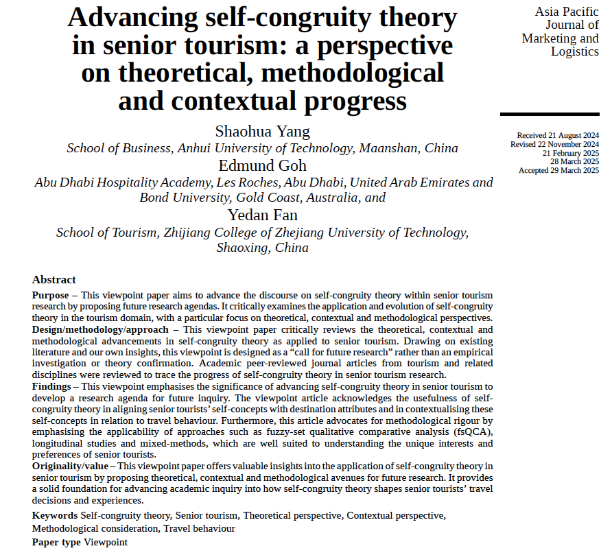 近日,公司杨少华副教授在国际高水平学术期刊《Asia Pacific Journal of Marketing and Logistics》(简称APJML,中文名《亚太营销与物流杂志》)发表题为《Advancing Self-Congruity Theory in Senior Tourism: A Perspective on Theoretical, Methodological, and Contextual Progress》的观点性论文。观点性论文不同于传统的实证研究,通常不依赖实地调查或数据分析,而是基于作者独特的学术视角、理论思考以及对特定现象的深入洞察,旨在提出新的研究议题,或对既有理论与实践进行批判性分析与创新性阐释。