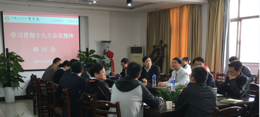 黄国才书记谈了自己学习十九大报告的感受,鼓励各系、各支部结合科研教学等方方面面,围绕报告中提到的新思想、新战略积极主动的学,原原本本的学。科研副经理方大春建议各系采用头脑风暴法,组织老师学习讨论,抓住时机,做好智库建设和课题申报工作。教学副经理章铁生认为老师们要结合各自专业领域,兼顾自己的学科基础,做好十九大内容进课堂工作。研究生副经理刘芳认为老师要言传身教、身先表率,做好研究,表示将在自己分管的工商系组织研讨。员工副经理张虎认为十九大报告为新时代高校年轻人培养指明了方向,老师们在教学中要坚持社会主义办学方向,在培养年轻人方面多思考、多实践。