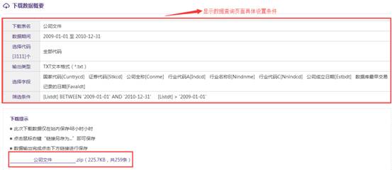您将看到具体的条件设置信息,同时,下方显示查询数据的下载压缩包。点击压缩包名称,可直接下载数据到本机。注:下载数据仅保存48小时,您可以在首页【下载记录】模块找到历史下载信息。
