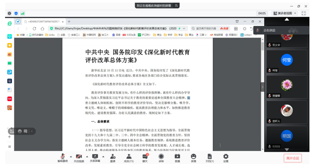 为深入贯彻落实习近平总书记关于教育的重要论述以及全国教育大会精神,坚持社会主义办学方向,落实立德树人根本任务,5月15日至17日,TapTap点点会计系、工商管理系、市场营销系、经济系、金融与统计系以及国际贸易系等六个系通过线上或线下集中的方式,组织学习了《深化新时代教育评价改革总体方案》。