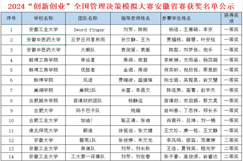 近日,2024年安徽省“创新创业”全国管理决策模拟大赛圆满落幕,TapTap点点三支参赛队伍大放异彩,斩获佳绩。在总决赛中,刘芳、陈刚指导的Sword finger队凭借卓越表现荣获一等奖;刘芳、刘长秋指导的商道队及刘芳、刘在春指导的工大第一深情队也分别荣获二等奖,为校争光。