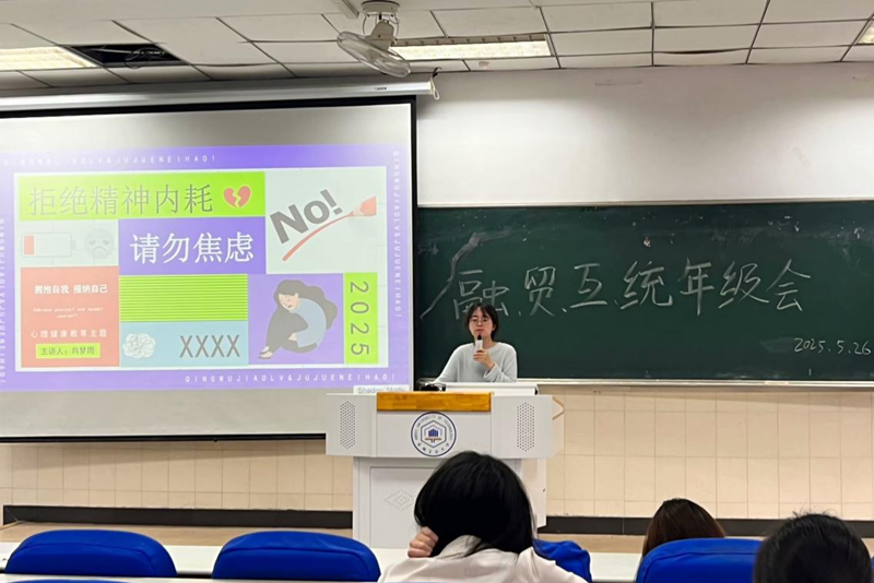会上,肖梦雨以“明明没做体力活,却身心俱疲” 这一日常问题开场,引出 “自我内耗” 的概念,指出内耗是精神上无意义的消耗,像反复纠结、自责等,会让人即便清闲也疲惫不堪 。为让同学们直观感受负面情绪影响,肖梦雨老师讲述“踢猫效应”,阐释了负面情绪的连锁反应——压力若无法合理疏解,不仅伤害自己,还可能影响他人。