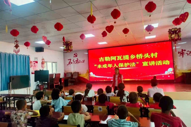 实践队奔赴阿克苏温宿县古勒阿瓦提乡,化身“青春护航者”,聚焦“中华人民共和国未成年人保护法”普及,以通俗易懂讲解、互动问答,为乡村青少年编织“法治防护网”;还组织青少年开展图书阅读分享活动,队员与孩子们围坐书架旁交流经典读物感悟,以书香为媒,搭建知识交流桥梁,让团结友爱种子扎根青少年心中,以青春行动诠释铸牢中华民族共同体意识,守护文化根脉、托举青春未来,书写“三下乡”实践文化润心篇章。