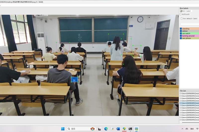 数据收集过程充满挑战。团队成员邀请同学参与场景模拟,在空教室中采取多方位录像,从不同角度捕捉异常行为。“我们通过模拟真实考场环境从前后左右等多角度进行数据拍摄,以提升模型的泛化能力和鲁棒性。”负责数据采集的程云麟介绍。